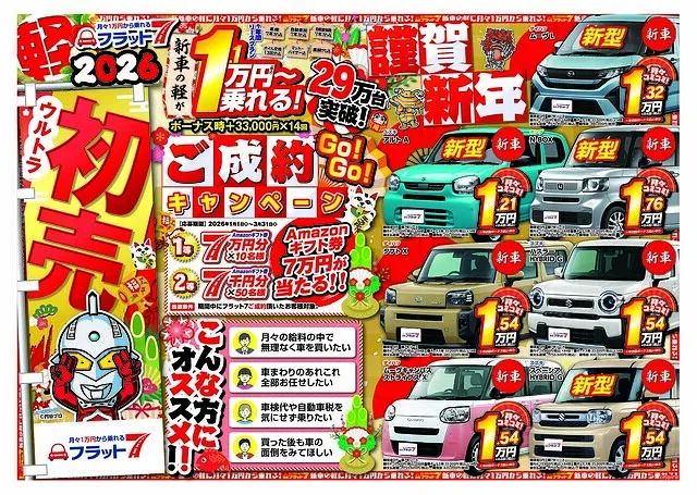 フラット7は、新車の軽自動車が月々1.1万円(税込)から乗れるカーリースです