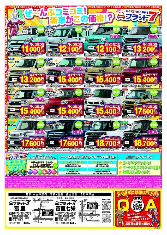 新しい軽自動車が並ぶフラット7富里七栄の店舗では、